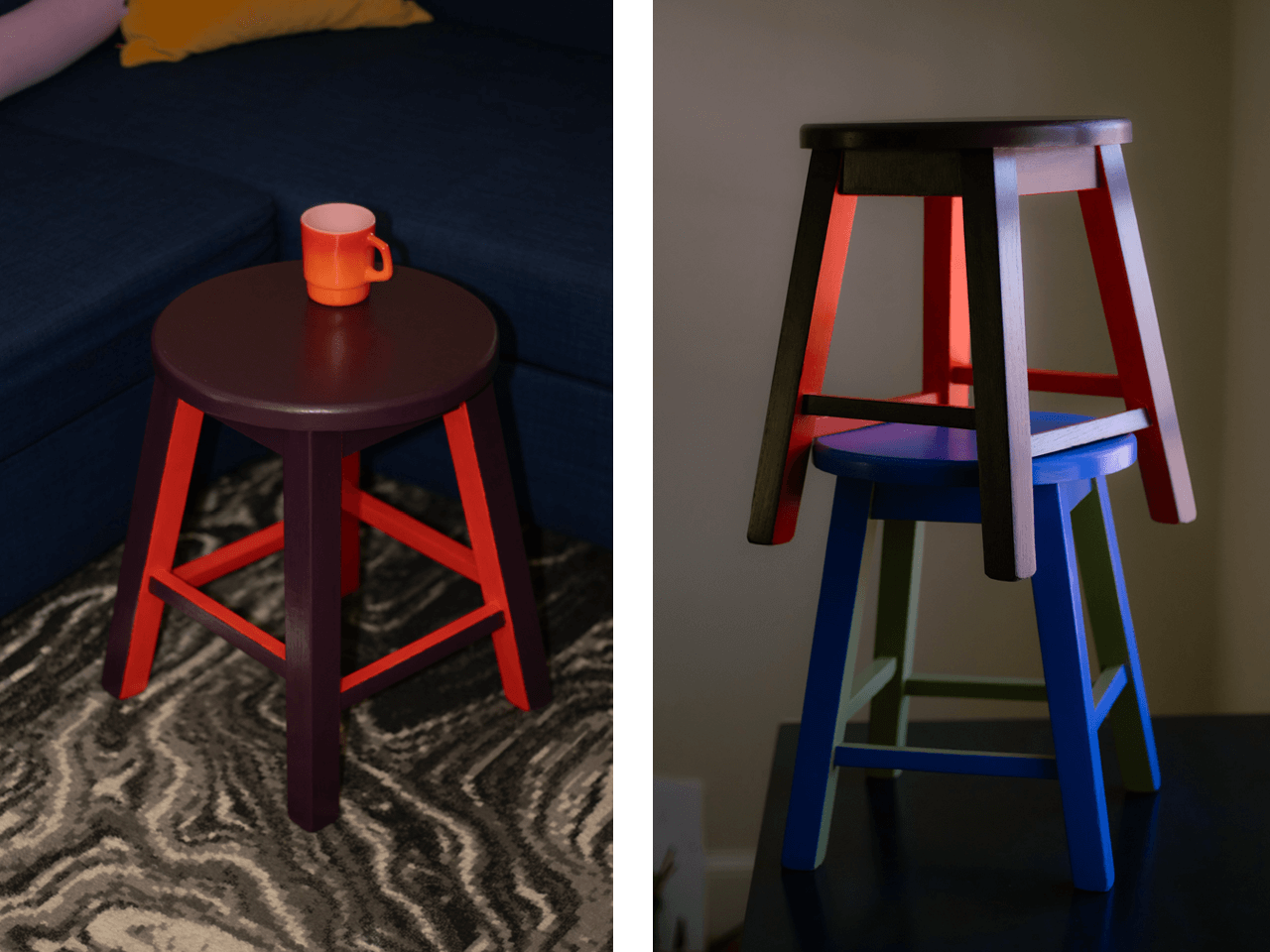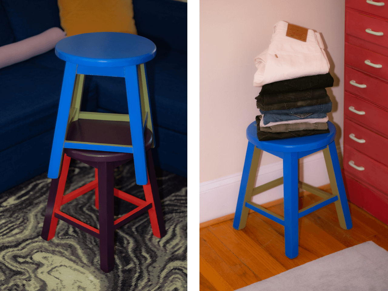 Painted oak stools. Acrylic paint, water-based polyurethane.